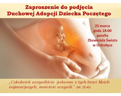 Uroczystość Zwiastowania Pańskiego od wielu już lat jest okazją do modlitwy o poszanowanie życia od poczęcia do naturalnej śmierci. Tego dnia wiele osób włącza się również w dzieło Duchowej Adopcji Dziecka Poczętego.